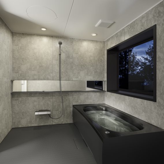 機能性に優れたスタイリッシュなシステムバス。モダンなデザインパネルが演出する洗練された空間で癒しのバスタイムを。