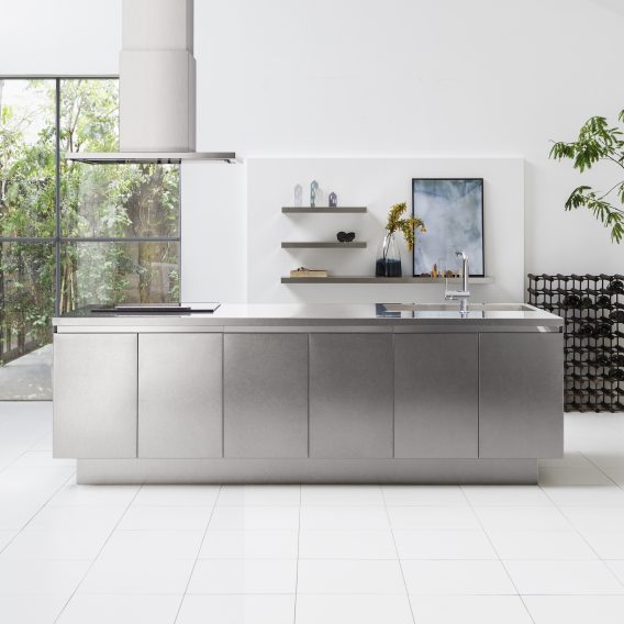 全面ステンレスの高級感のある外観はもちろん、サイドパネルや扉の小口を見せない留め加工など細部へのこだわりで、スッキリとしたデザインを実現。LDKをハイグレードな空間に変えるステンレスキッチンです。
