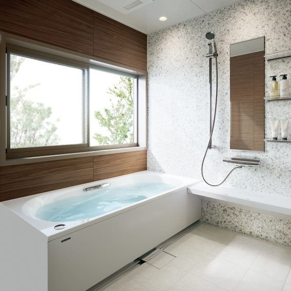システムバスは、1.美しい壁 2.足もとの上質感 3.空間を無駄なく 4.続くぬくもり 5.揺れに負けない構造 6.誰もが使いやすい 6つのオリジナルで美しさも使いやすさもずっと続きます。