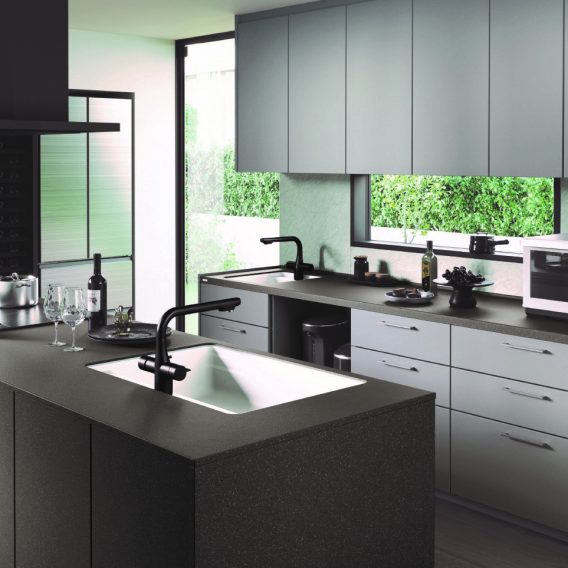 人造大理石カウンター&シンクを標準装備。暮らしに合わせてプランやカラーバリエーションを充実させながらも、シンプルで選びやすいシステムキッチンです。