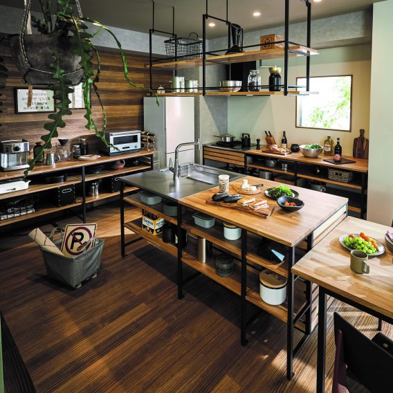 ステンレスと無垢の木、アイアンフレームの質感はベストマッチ。黒いフレームは、カジュアルなインテリアをグッと引き締めつつ格上げしてくれます。