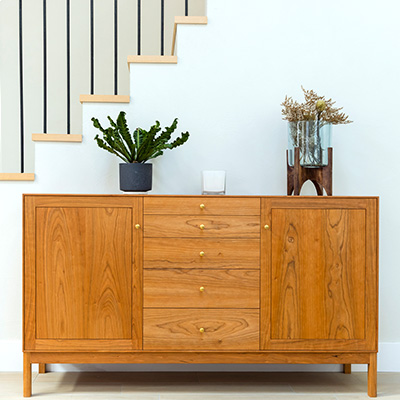 テレビボードと組み合わせて置くことが多い「サイドボード」。もちろん、単体でも絵になる家具です。引き出しや扉付きのタイプは、リビングに集まる細々としたモノをすっきりと収納することができます。また、上部はアートやオブジェ、植物などを飾るディスプレイコーナーとしても役立ちます。