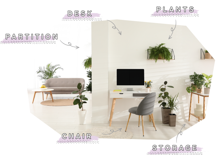 部屋を目的に合わせて緩やかに区切る「ゾーニング」によって、仕事場とくつろぎの場を分けることができます。また間仕切りアイテムを取り入れることで、壁がなくてもほどよいプライベート感が得られるため部屋の中央をワークスペースとして活用することも可能です。