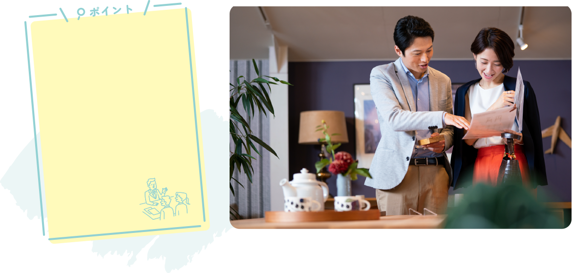 予算オーバーを防ぐために、あらかじめ予算を決めておきましょう。アドバイザーに予算を伝えておくと、予算に合わせた提案を受けられて、打ち合わせがスムーズに進みます。