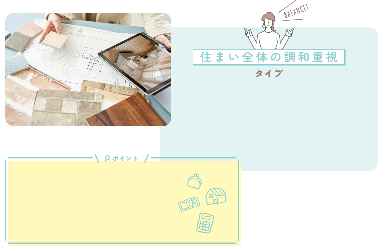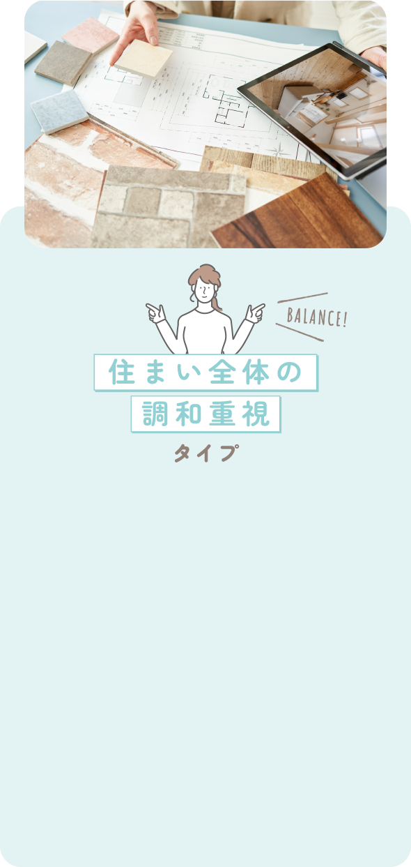 「家全体のイメージを統一したい」と住まい全体の調和を考えてリフォームしたいあなた。住宅設備からフローリング、壁紙、家具やカーテンに至るまで、バランスをみながらコーディネートを考えたいですよね。色や素材のサンプルを見て質感を確かめたり、組み合わせを試してみたり、アドバイザーに相談してプロの視点からアドバイスをもらうのがおすすめです。