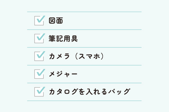 リフォーム会社のショールームを見学する際は、以下のアイテムを持っていきましょう。